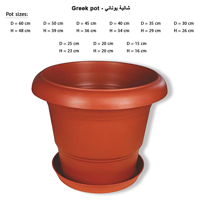 أصيص يونانية بتصميم كلاسيكي مستوحى من الطراز اليوناني الأصيل، متوفرة بعدة مقاسات لتناسب مختلف المساحات والاستخدامات. تتميز بلونها الأحمر البني الدافئ الذي يضيف لمسة تراثية وأنيقة لأي مكان، سواء داخل المنزل أو في المساحات الخارجية.