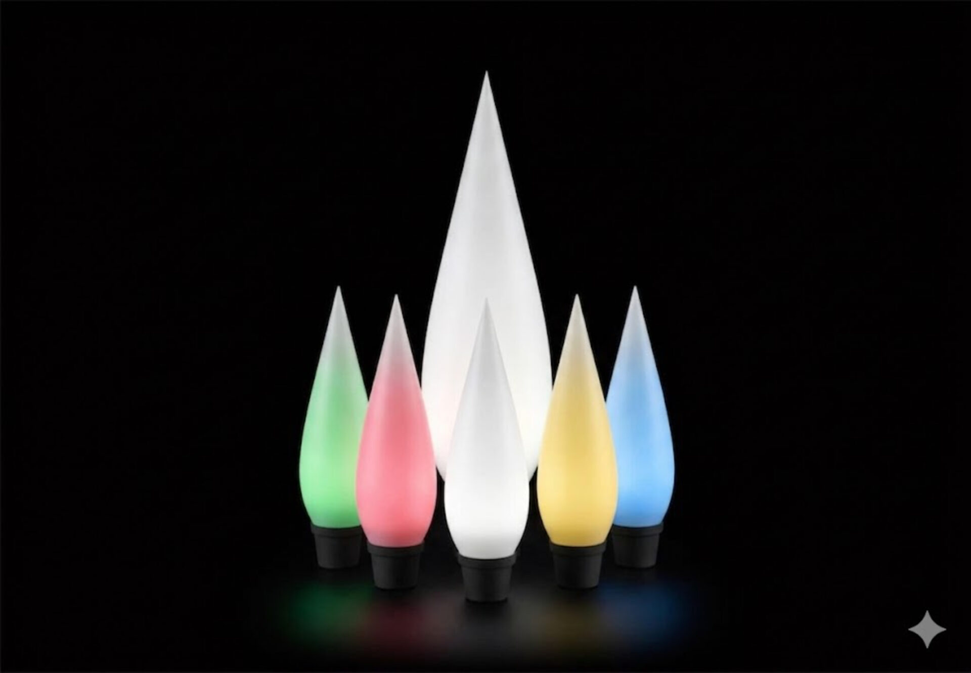 Background: The background is entirely black, highlighting the vibrant glow of the colors and making the design look like illuminated decorative pieces suitable for gardens, pathways, or dim indoor night lighting.
