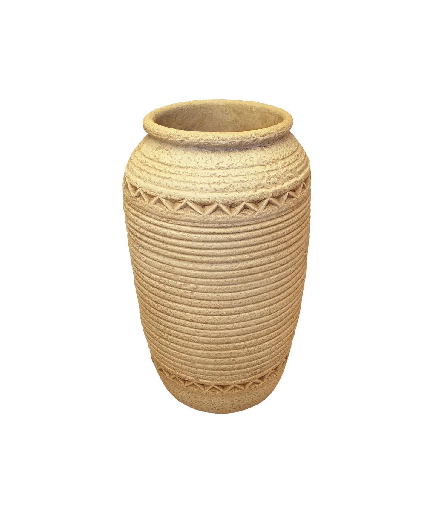 A decorative clay pot with a traditional design, featuring intricate geometric patterns and raised lines that showcase authentic craftsmanship. A perfect piece to add a touch of heritage to any space.